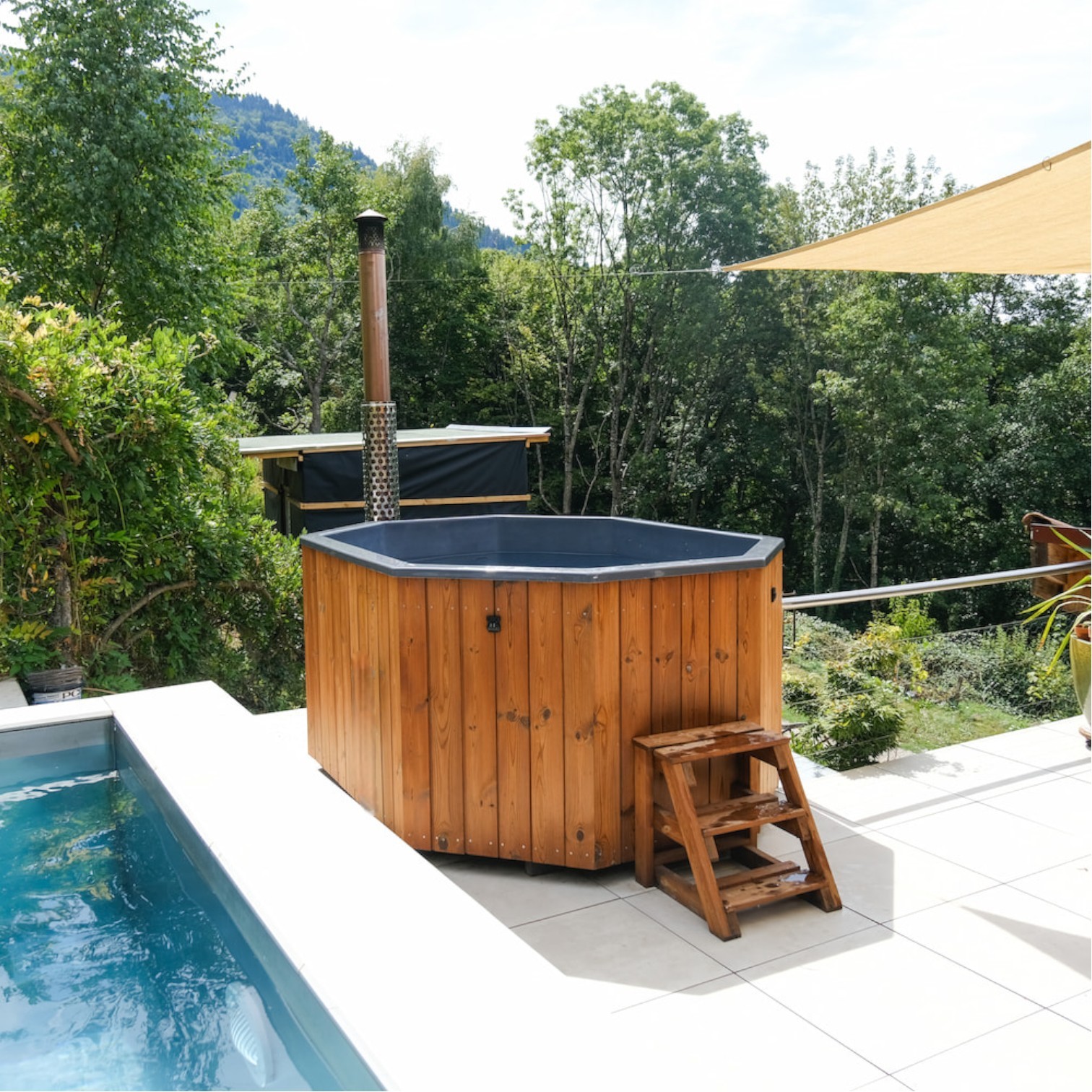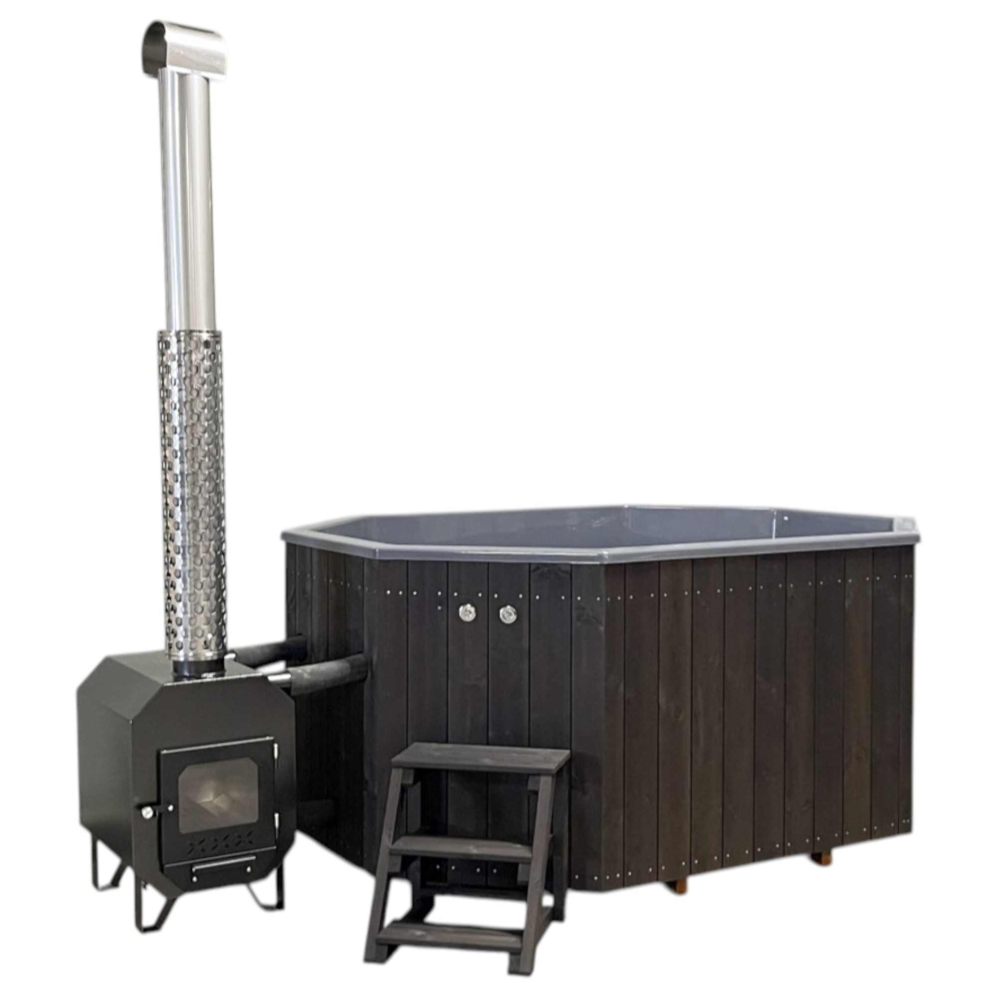 🔥 Chauffage au feu de bois – Grâce à son poêle performant de 35 kW, l’eau atteint les 38 °C en seulement 2h avec quelques bûches seulement. Une expérience sensorielle unique, naturelle et économique.